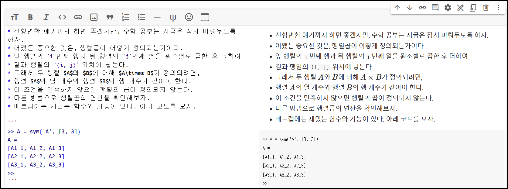 위키독스에 매트랩 책을 쓰고 있다. 그런데 위키독스의 마크다운 에디터는 여러모로 불편하다. Preview pane이 없던 문제는 StackEdit로 해결되긴 했는데, StackEdit는 그것대로 또 자잘한 버그가 있다. 무엇보다 스페이스바가 간혹 안 눌리는 문제가 제일 심각하다. 그래서 생각해 낸 꼼수가...