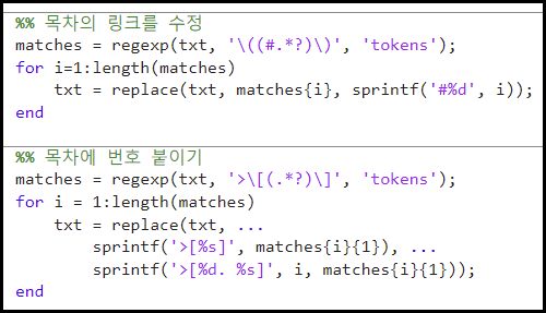 솔루션: 정규식으로 '>[뭐뭐]' 패턴을 찾아서 일련번호를 추가한다. 원래 regexp는 인덱스를 반환하는데, 'tokens' 옵션을 쓰면 찾은 문자열 자체를 셀 배열로 반환한다. 이 경우 2, 3번째 반환값이 startIdx와 endIdx이다. 괄호(소, 중, 대 모두)는 정규식 문법의 일부이므로, 문자로서 괄호를 찾으려면 \(, \{, \[처럼 써야 한다. 인덱스를 사용하는 것보다 replace가 더 편해보여서 아래와 같이 작성했다.
