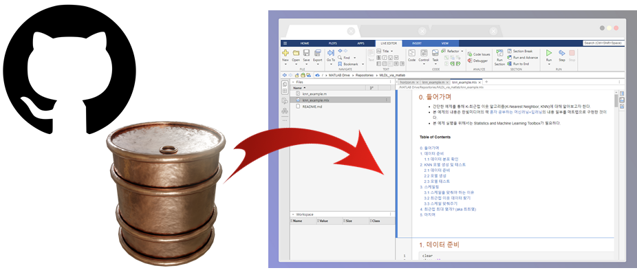 3. 해당 repository의 knn_example.mlx 파일이 MATLAB Online에서 열립니다.