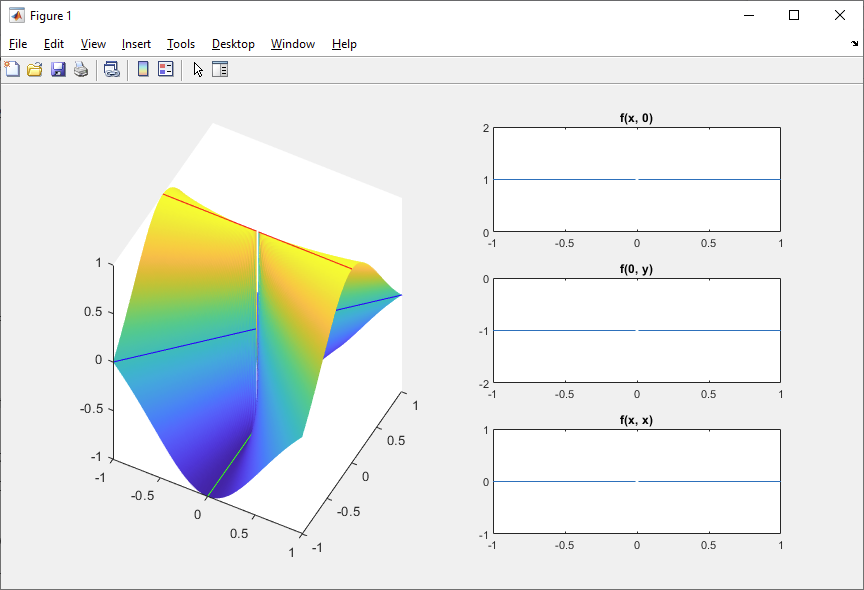 subplot(3, 2, 6), plot(diag(xx), diag(zz)), title('f(x, x)')
